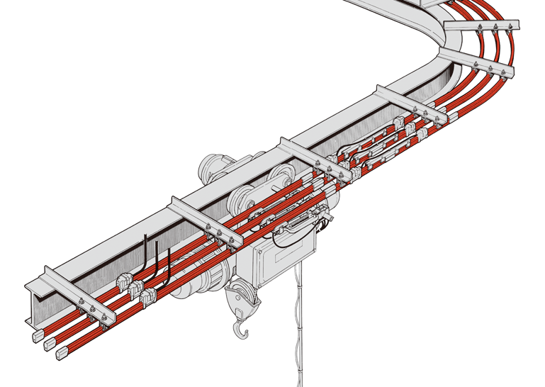 単線型の絶縁トロリーで、3mの本体をジョイントするだけの簡単施工。さまざまな特殊電路も容易に組めます。90A、300A、500Aが揃っています。