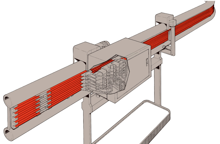 接触面積の大きいV型導体。高速でも給電が安定しており、離線などによるトラブルを防げます。しかも、8P敷設でわずか124mmの省スペース型、制御線の多線化にお応えできます。定格は600V90A。